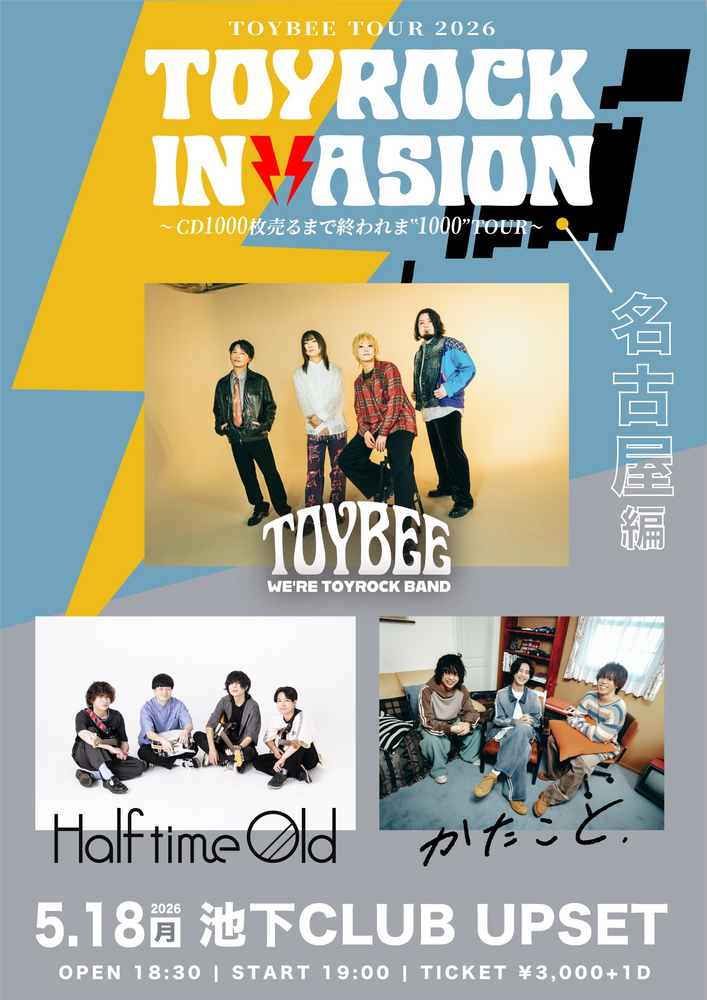 TOYBEE presents「TOYROCK INVASION TOUR」名古屋編 EVENT 2026/05/18(月) 名古屋|池下CLUB UPSET 開場 18:30 / 開演 19:00 出演 toybee / Half time Old / かたこと TICKET ・Livepocket ・e+ URLをコピーする 報告する