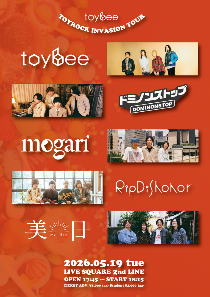 TOYBEE presents 「TOYROCK INVASION TOUR」 大阪編 EVENT 2026/05/19(火) 大阪|LIVE SQUARE 2nd LINE 開場 17:45 / 開演 18:30 出演 toybee / mogari / ドミノンストップ / RIP DISHONOR / 美日 TICKET ・e+ URLをコピーする 報告する