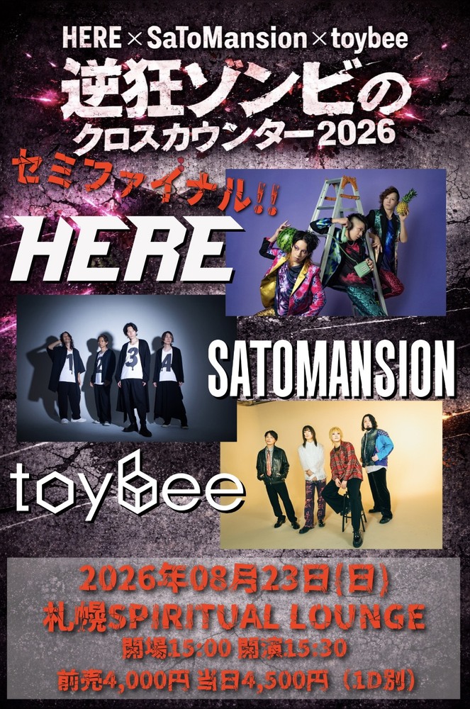 TOYBEE TOUR 2026「TOYROCK INVASION」特別編 HERE × SaToMansion × toybee スプリットツアーセミファイナル!! 〜逆狂ゾンビのクロスカウンターT EVENT 2026/08/23(日) 北海道|札幌SPIRITUAL LOUNGE 開場 15:00 / 開演 15:30 出演 TOYBEE / SaToMansion / HERE TICKET ・一次先行受付期間(抽選)4/4(土)12:00〜4/12(日)23:59 ・一般発売 4/29 12:00〜 URLをコピーする 報告する