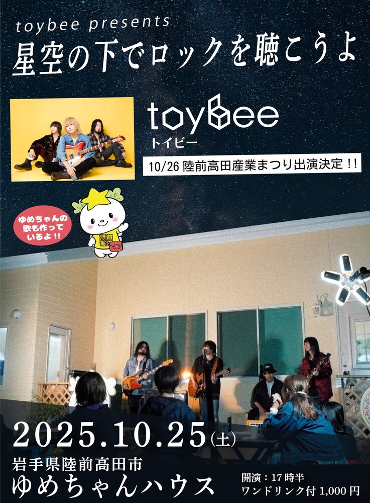 toybee presents 星空の下でロックを聴こうよ EVENT 2025/10/25(土) 岩手|ゆめちゃんハウス 開演 17:30 TICKET:ご予約はこちらhttps://ssl.form-mailer.jp/fms/08dfb3ac864189 URLをコピーする 報告する