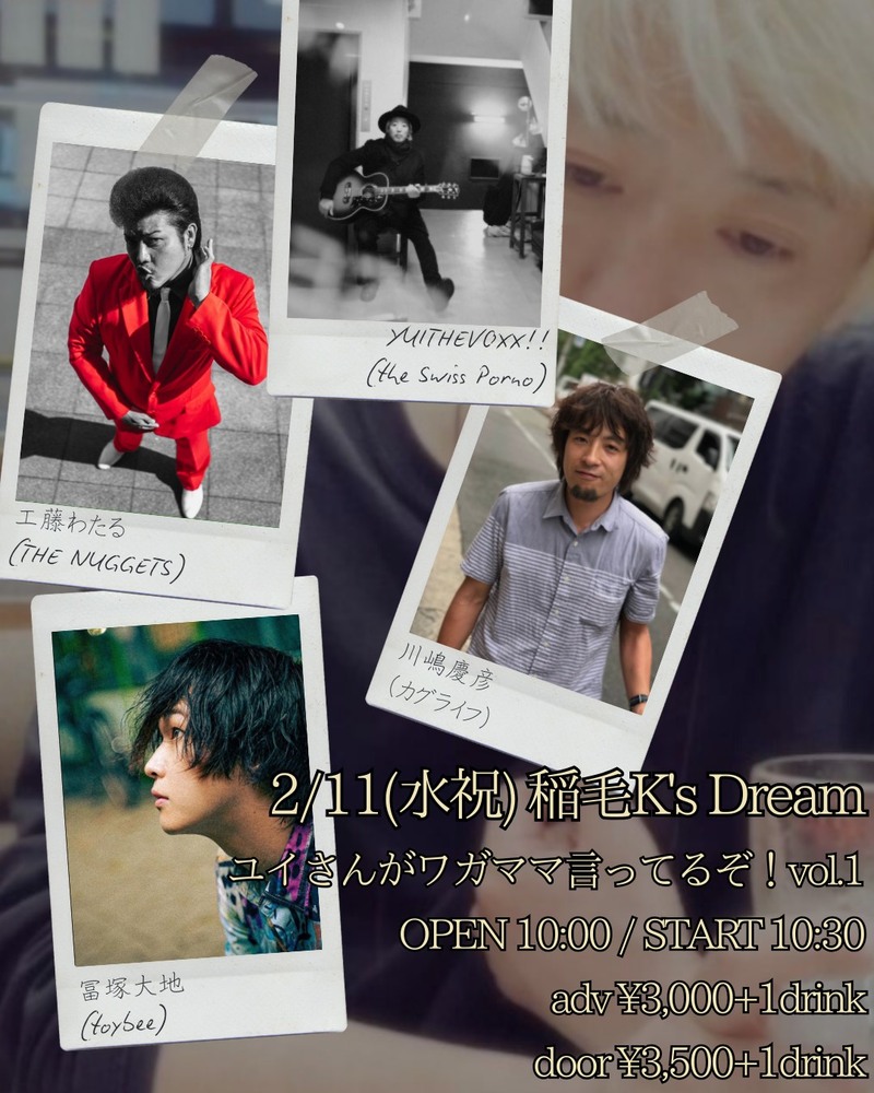 ユイさんがワガママ言ってるぞ!vol.1 EVENT 2026/02/11(水) 千葉|稲毛K'S DREAM 開場 10:00 / 開演 10:30 出演 YUITHEVOXX!! / 冨塚大地 / 工藤わたる / 川嶋慶彦 TICKET:https://www.toybee.jp/ticket-contact※チケットお取り置きフォームにて、ご用件、お名前、枚数を記入の上お送りください。 URLをコピーする 報告する